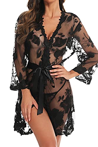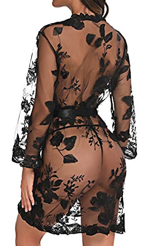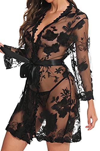Aranmei Damen Spitze Kimono Robe Dessous Gestickte Mesh Chemise Nachthemd V-Ausschnitt Babydoll Braut Dessous Hochzeit Roben