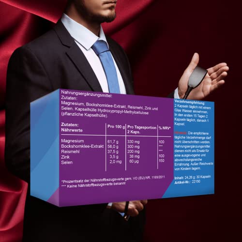 Magnesium, Bockshornklee-Extrakt, Reismehl, Zink, und Selen. Kapselhülle Hydroxypropyl-Methylcellulose (pflanzliche Kapsehülle)