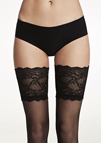 - Elegante Spitzenbordüre: Eine 10 cm breite, fein gearbeitete Spitze rundet das Design stilvoll ab. Sie bietet sicheren Halt und setzt ein raffiniertes Highlight, das Ihre Beine gekonnt in Szene setzt