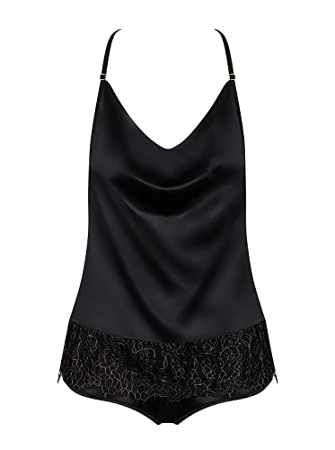 Wunderschönes Oberteil und Shorts aus weichem Satin, schwarz. Das Oberteil hat einen tiefen Ausschnitt und eine einzigartige Rückseite mit schwarzen und goldenen Spitzenverzierungen an den Schulterblättern und am Saum. Verstellbare Träger vorne und hinten. Mit Spitze verzierte Shorties mit einem femininen Schnitt, der die Beine und den Po betont.