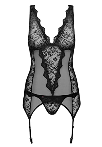Dieses schicke Dessous-Set aus einem edlen Korsett-Body mit Strumpfhaltern und einem String erfüllt alle Wünsche einer anspruchsvollen Frau. Die Marke Obsessive steht für Qualität und sinnliche Eleganz. Das Strapshemdchen ist wunderschön und detailverliebt mit zarten Spitzenapplikationen verziert. Dank des hochwertigen und flexiblen Materials passt sich das Set perfekt dem Körper an und betont die Figur auf eine bezaubernde Weise. Die verstellbaren Träger ermöglichen den optimalen Sitz und das trendige Design mit der feinen Schnürung