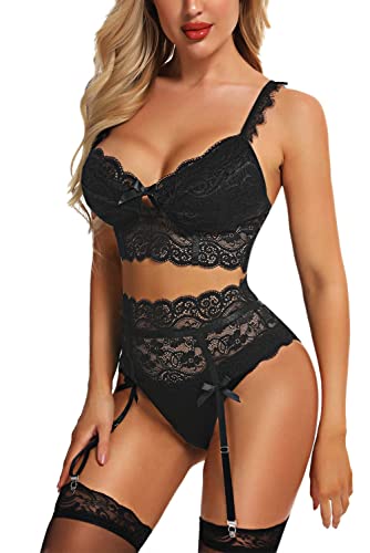 Aranmei Damen-Dessous-Set, florales Spitzengürtel, 3-teiliges Dessous, BH und Höschen, Strumpfgürtel (ohne Strümpfe)