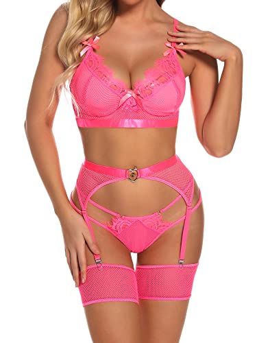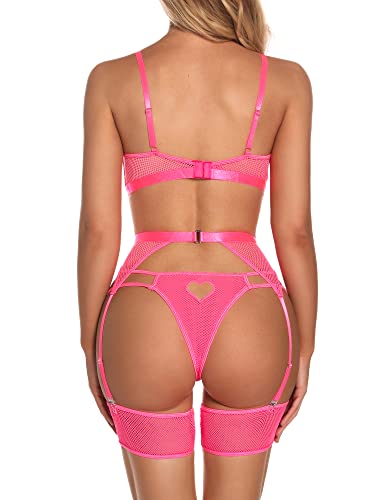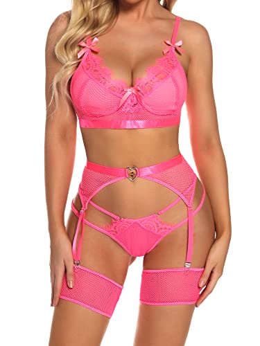 Dieses Aranmei Damen Sexy 4-teilige Dessous-Set in verführerischem Rose ist ein absolutes Must-Have für jeden besonderen Anlass. Das Set besteht aus einem BH mit wunderschönem Wimpernspitzenbesatz, dreieckigen Körbchen und einem süßen Krawattenknoten, der Ihre feminine Seite betont. Der herzförmige Metallring auf der Vorderseite und das ausgeschnittene Design auf der Rückseite verleihen diesem Dessous-Set eine verführerische Note. Der hohe Taillengürtel passt perfekt zu dem hoch geschnittenen Tanga