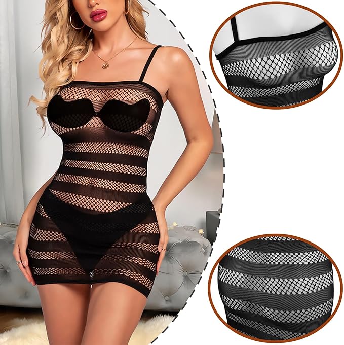 Das Mini-Dessous-Kleid aus Netzstoff ist elegant und besonders, mit vielen schwarzen horizontalen Streifen, die einen Teil des Körpers verstecken und den Menschen ein geheimnisvolles Gefühl verleihen.