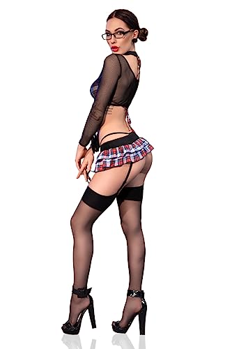Außergewöhnliches Dienstmädchenkostüm: Ein sinnliches BH Top und Rock und Krawatte mit verstellbare Träger für eine perfekte Passform. Kurzes Top und Rock mit Brustausschnitt mit schwarzen Strapseneinsätzen und Schleife. Netz-Top und Rock mit BH-Cups und einem karierten Röckchen. Im Set enthalten: Top und Rock, Krawatte, Netzstrümpfe, String und Brille.