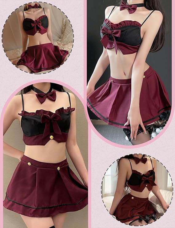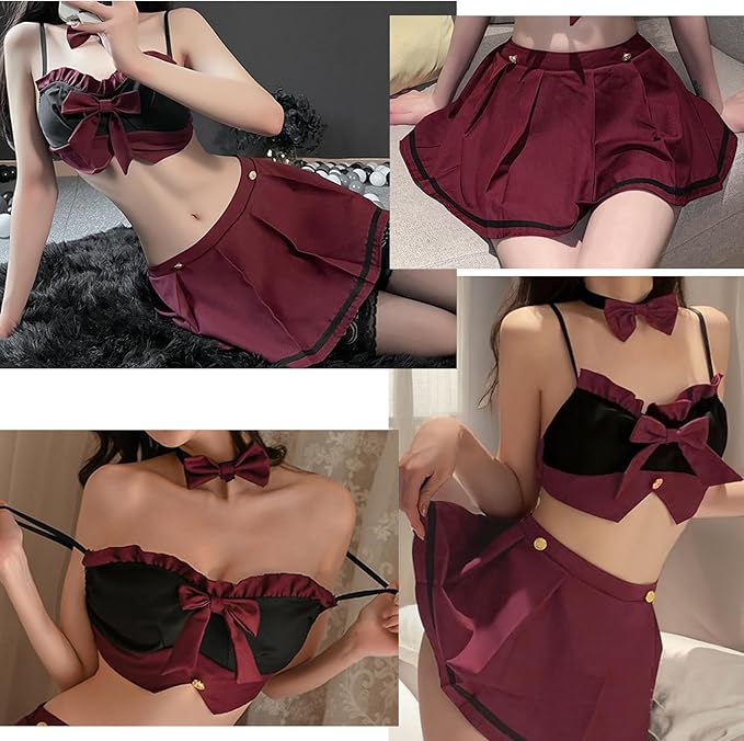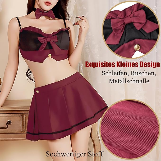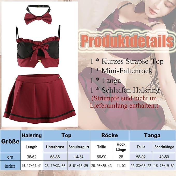 - ?[Packungsinhalt]: 1 * kurzes Oberteil + 1 * Mini-Faltenrock + 1 * Tanga + 1 * Fliege (Strümpfe sind nicht im Lieferumfang enthalten). Es wird empfohlen, es von Hand in kaltem Wasser zu waschen, zum Trocknen aufzuhängen und nicht zu bleichen. Wenn Sie Fragen zu unseren Produkten haben, können Sie sich gerne an uns wenden.