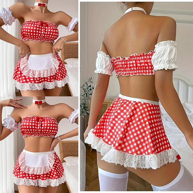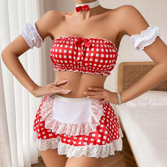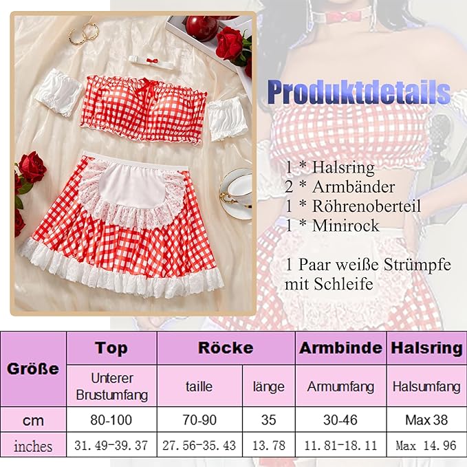 - ?[Französisches sexy süßes Dienstmädchen Kostüm]: Rot-weiß kariertes Tube-Top und kurzer Rock, gerüschte Armbinden, Halsring mit Schleife, gepaart mit sexy Strümpfen mit Schleife lassen Sie perfekt in die Rolle eines süßen Dienstmädchens eintauchen und bieten Ihnen ein hervorragendes visuelles Fest.