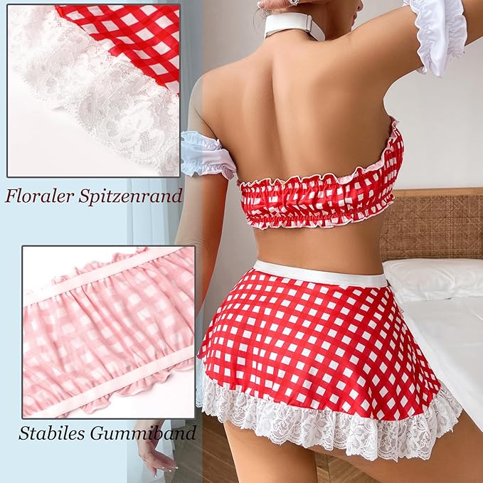 ✨Sexy Dienstmädchen-Cosplay-Babydoll-Uniform-Set, rot-weiß kariertes Farbschema. Die große Schleifenverzierung sorgt für ein niedliches und verspieltes Bild. Der Spitzen-Minirock betont die Linien der Beine und ist sexy und auffällig.