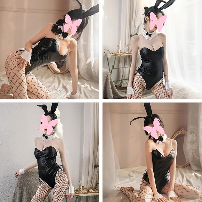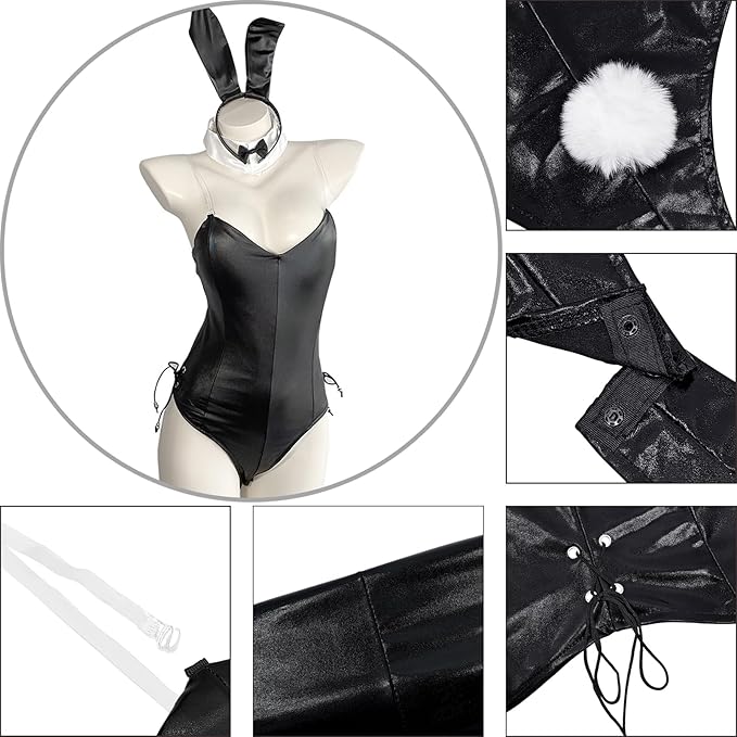 - ?[Bequemes und Passendes Design]: Dieses schwarze Lackleder-Bunny-Girl-Unterwäscheset im Tube-Top-Design mit verstellbaren transparenten Trägern kann das Kostüm richtig fixieren; es gibt Druckknöpfe im Schritt für einfaches An- und Ausziehen; es gibt verstellbare Bänder an der Taillenseite, um die Größe entsprechend deiner Körperform anzupassen.