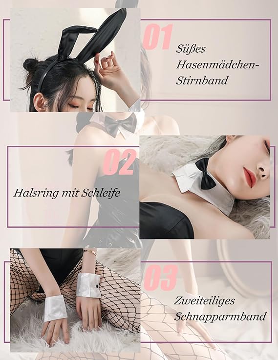 - ?[Erstelle ein Anderes Bunny Girl]: Das süße Bunny Girl-Rollenspielkostümset enthält ein Hasenohren-Stirnband, das nach Belieben gebogen werden kann, einen pelzigen Hasenschwanz und zwei Druckknopf-Armbänder, um einen verspielten und sexy, charmanten Look für dich zu kreieren.