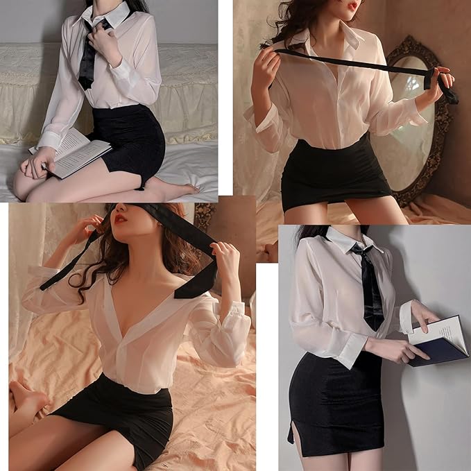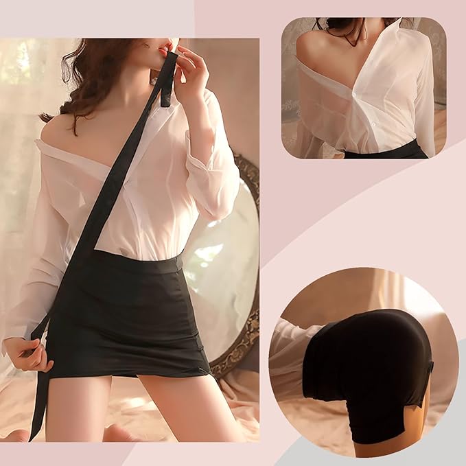- ?[Klassisches und Charmantes Design]: Das klassische weiße Hemd mit tiefem V-Ausschnitt besteht aus transparentem Tüllstoff, der sehr geheimnisvoll und attraktiv ist; der schwarze Minirock verlängert die Beine optisch und bringt Ihre Beinlinien zur Geltung.