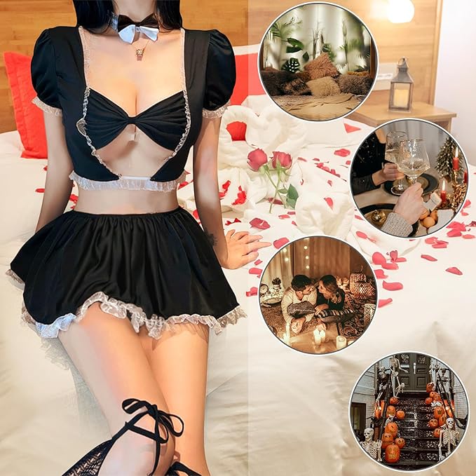 - ?Einzigartiges Design: Der französische Dienstmädchen-Uniformanzug hat ein geteiltes Design – ein hohles kurzes Oberteil mit V-Ausschnitt und Puffärmeln + einen einteiligen Minirock mit Haken und Ösen an der hinteren Taille. Es kann die schlanke Taille und die schlanken Beine hervorheben, was sehr sexy und verspielt ist.