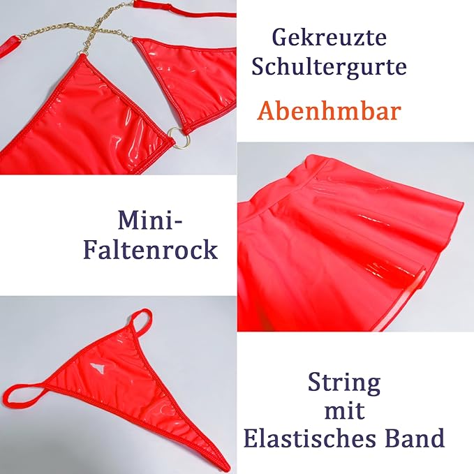 - ? [Packungsinhalt]: 1 * metallischer Ketten-Latex-BH + 1 * Leder-Miniröcke + 1 * Tanga + 1 * Hasenohr-Haarreif.