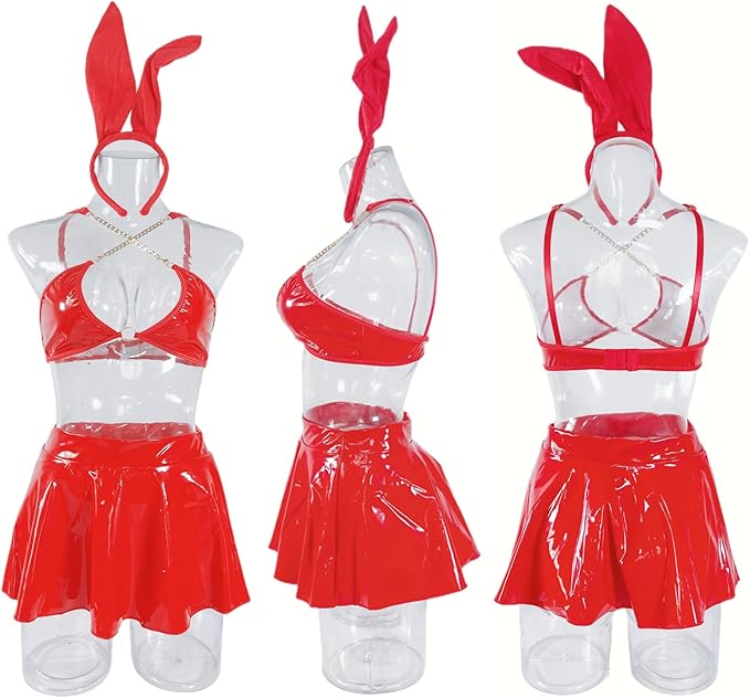 1 * metallischer Ketten-Latex-BH + 1 * Leder-Miniröcke + 1 * Tanga + 1 * Hasenohr-Haarreif.