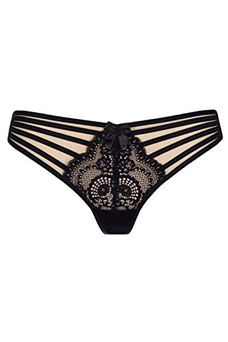 - Interessant verzierter String mit schwarzer durchbrochener Spitze und Bändern auf beigenfarbenen Hintergrund
