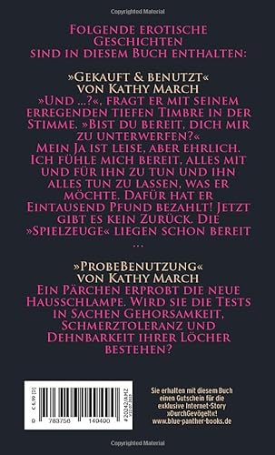 Dieses Taschenbuch enthält zwei aufregende erotische Geschichten, die Ihnen den Atem rauben werden. In der Geschichte "Gekauft & benutzt" von Kathy March wird eine Frau von ihrem Partner in die Welt des BDSM eingeführt. Mit einem erregenden tiefen Timbre in der Stimme fragt er sie, ob sie bereit ist, sich ihm zu unterwerfen. Ihr leises Ja zeigt ihre Entschlossenheit, alles für ihn zu tun. Doch es gibt kein Zurück mehr, nachdem er Eintausend Pfund für diese Erfahrung bezahlt hat. Die "Spielzeuge" liegen bereits bereit und versprechen eine aufregende Zeit