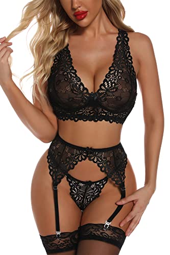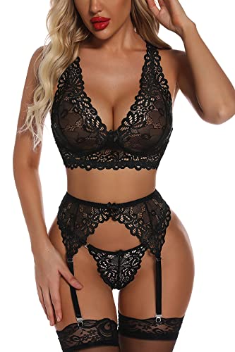 Sexy Dessous Set für Frauen frech mit Strumpfgürtel, Spitze BH und Höschen Set Hohe Taille Strapsen Dessous Set