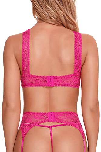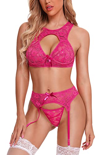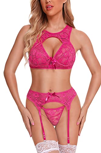Dieses Aranmei Dessous Damen Sexy Unterwäsche Strapse Dessous Aushöhlen Sexy Lingerie Babydoll Dessous Spitzen BH, Panty, Strumpfhalter 3-teilige Unterwäsche Set in Rosarot ist das perfekte Accessoire, um Ihre Sinnlichkeit zu betonen. Hergestellt aus hochwertigem Material, bestehend aus 95% Polyester und 5% Elasthan, bietet dieses Set eine mittlere Elastizität, die eine großartige Passform gewährleistet und fantastisch aussieht. Das Design mit einem hohen U-Ausschnitt, einem ausgehöhlten BH und einem String-D
