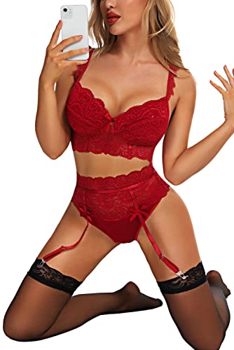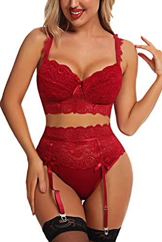 Aranmei Damen-Dessous-Set, florales Spitzengürtel, 3-teiliges Dessous, BH und Höschen, Strumpfgürtel (ohne Strümpfe)