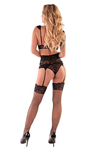 Edles 4-teiliges Set gefertigt aus zarter Blütenspitze Mit verstellbaren Trägern und einem verstellbaren Hakenverschluss auf der Rückseite An den Trägern ebenfalls mit zarter Blütenspitze versehen Mit eingearbeiteten Bügeln Der abnehmbare Strumpfgürtel aus Spitze liegt angenehmen auf der Haut Die festgenähten Strapshalter sind verstellbar Dazu ein passender String Die Strümpfe sind im Set enthalten Größe: S/M, L/XL Farbe: schwarz Material: 90% Nylon, 10% Elasthan