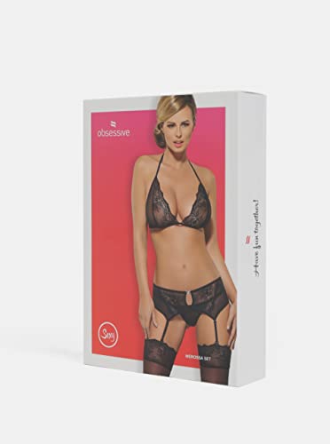 Mit diesem Obsessive Damen Dessous-Set wirst du definitiv alle Blicke auf dich ziehen! Das Set, bestehend aus einem BH, einem Strapsgürtel und einem String, ist in einer tollen Geschenkbox verpackt und eignet sich daher perfekt als Geschenk für einen besonderen Menschen oder für dich selbst. Das Set ist aus hochwertigem schwarzen Spitzenstoff gefertigt und verleiht dir einen verführerischen Look. Der BH und der String sind ouvert, was bedeutet, dass sie mit Öffnungen versehen sind und somit eine zusätzliche erotische Note bieten. Der Verschluss erfolgt über Haken und Ösen